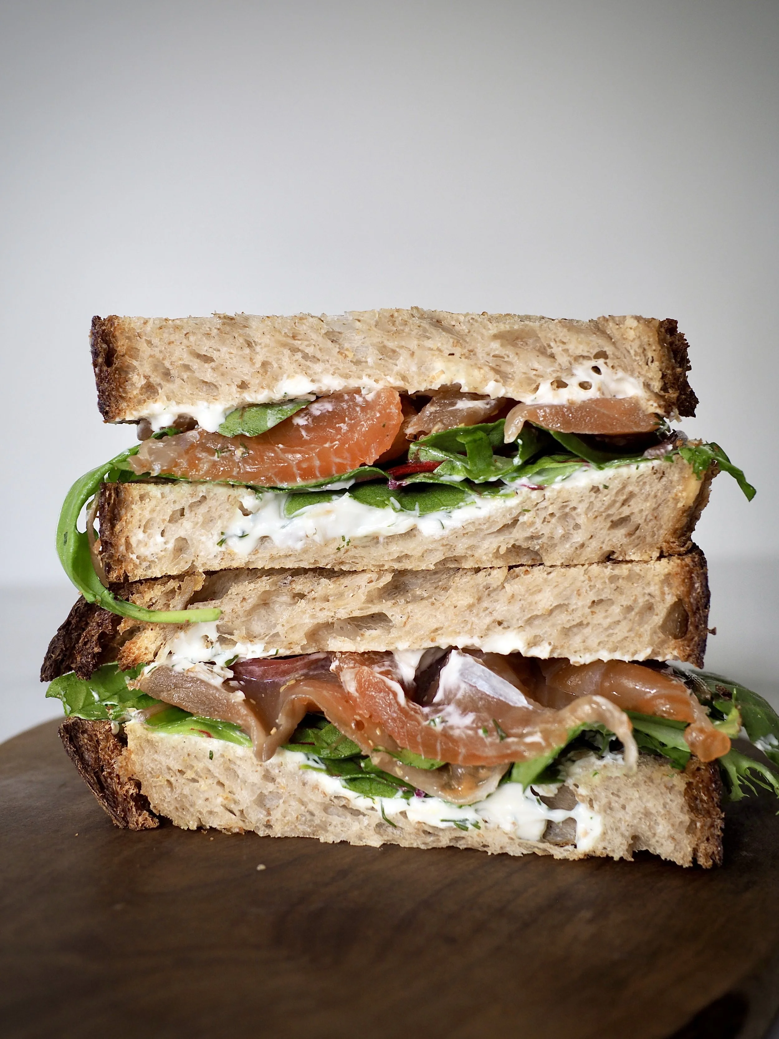 Toasted sourdough, mixed salad, mustard dressing, gravlax salmon, rocket dill cream cheese.