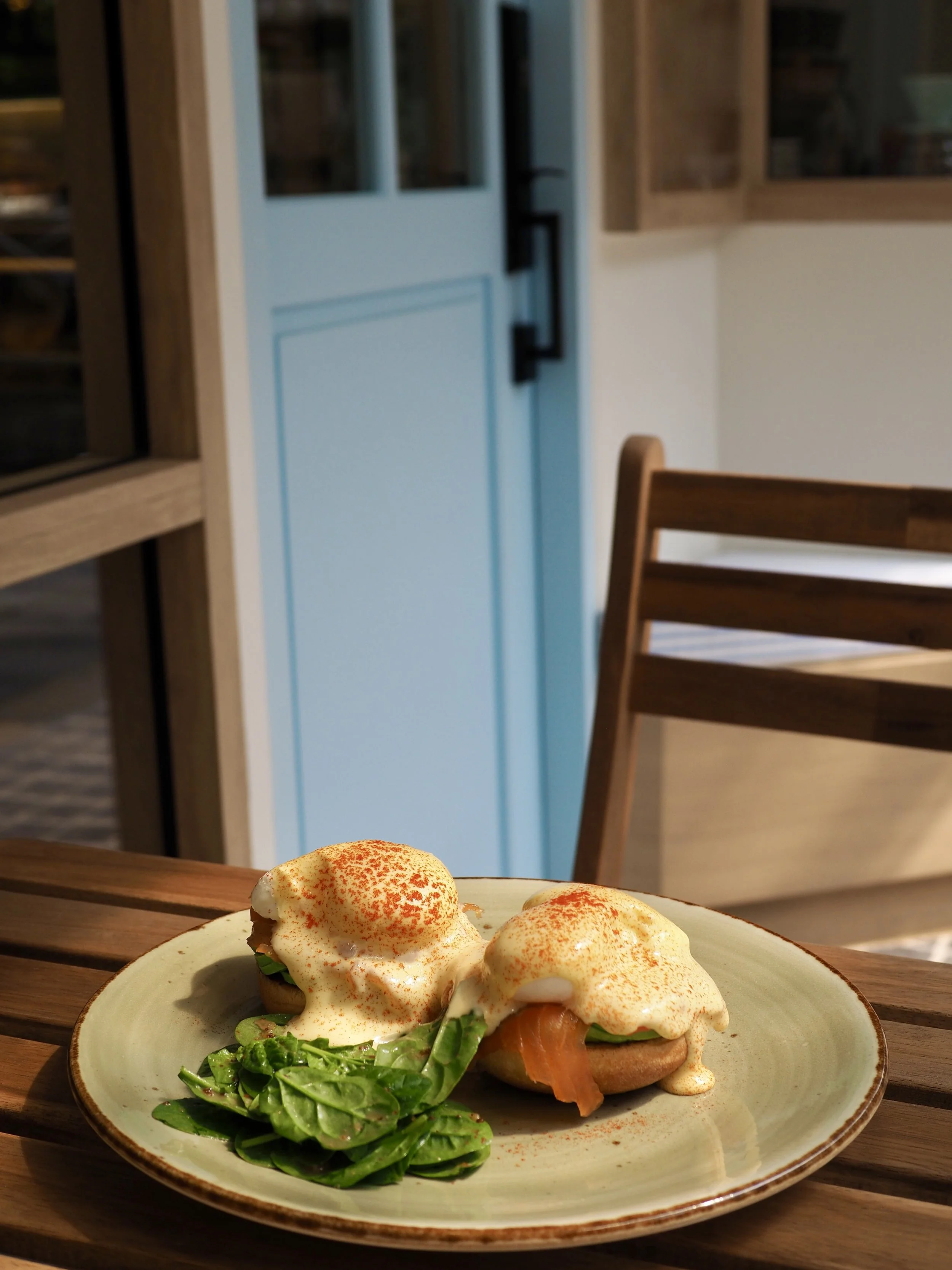 Gravlax, Avocado, muffin, hollandaise, baby spinach