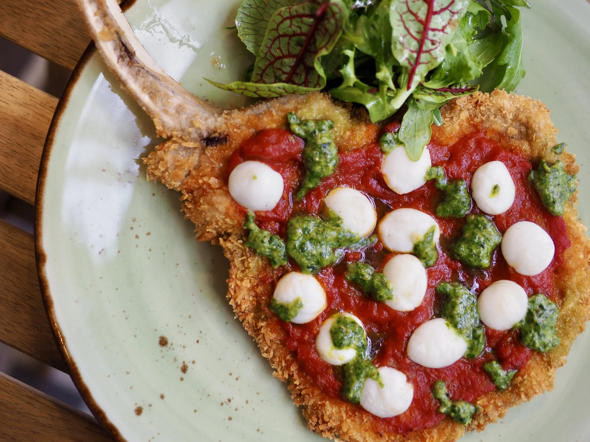 Breaded pork chop, tomato, mozzarella and basil pesto